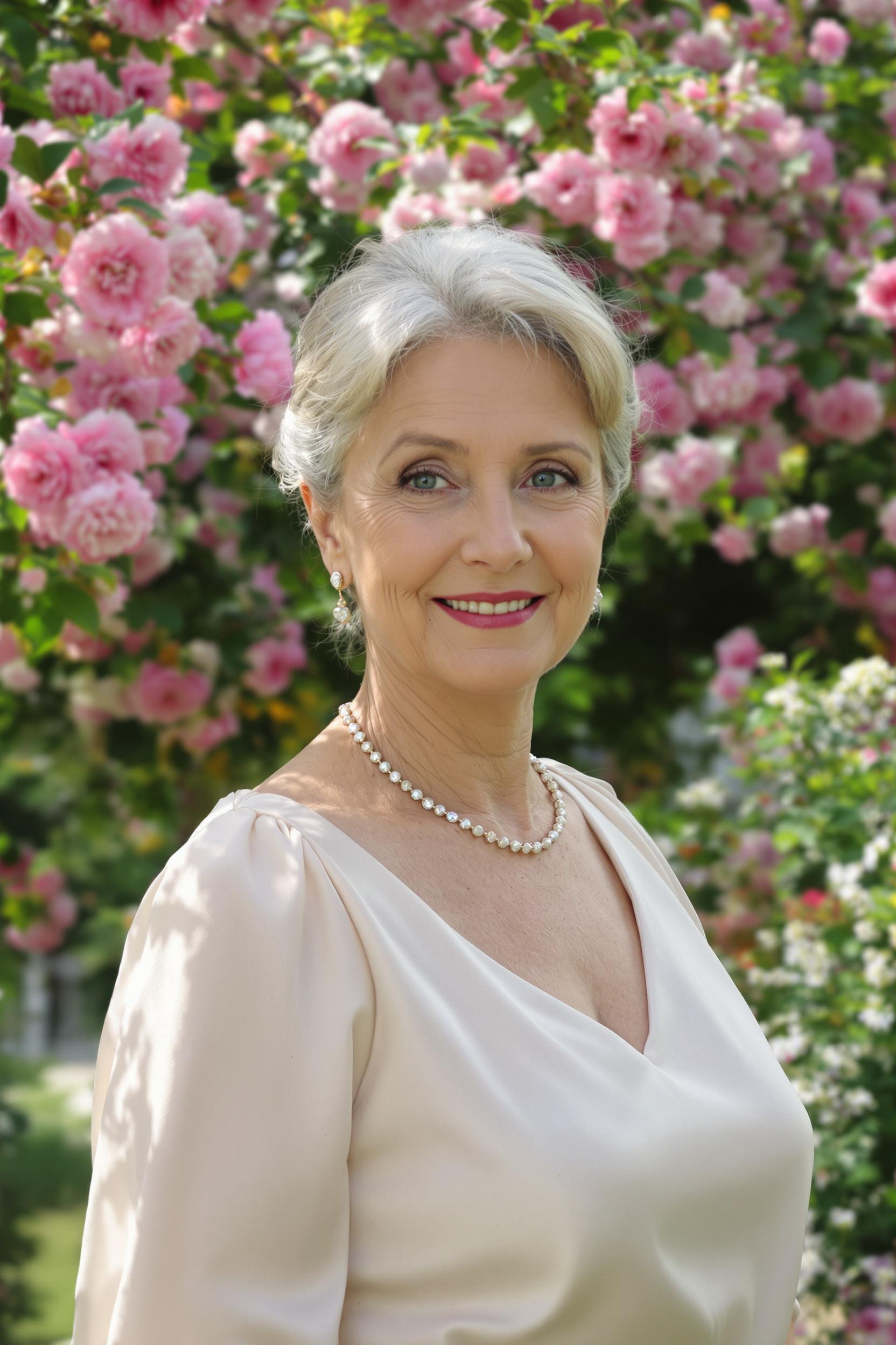 Женщина 55 лет, светлые волосы, элегантное платье в пастельных тонах, стоит среди цветущего сада, мягкий дневной свет, смотрит прямо в камеру, спокойная улыбка, зелёная листва на заднем плане.