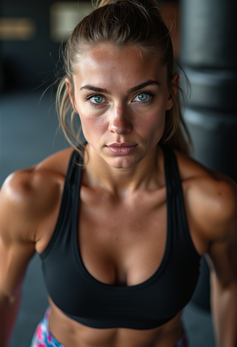 Женщина-боксёр в спортивном топе и леггинсах держит перчатки на плечах, лицо в поту, глаза устремлены в камеру с уверенным выражением. Крупный план, светотени создают драму образа.