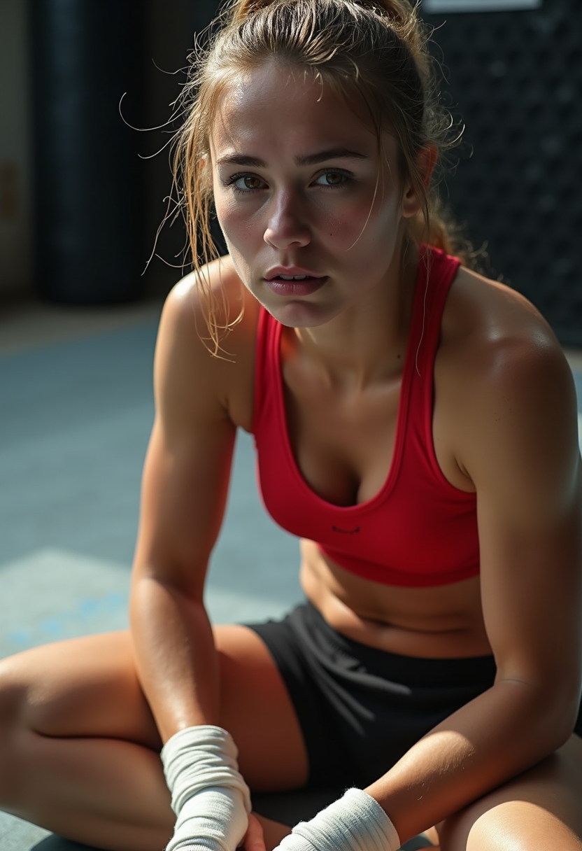 Примерить образ на себеЖенщина-боксёр с растрёпанными волосами сидит на полу у ринга, держа перчатки в руках. На лице пот и решимость, взгляд — в камеру. Крупный план, создающий атмосферу борьбы и преодоления.