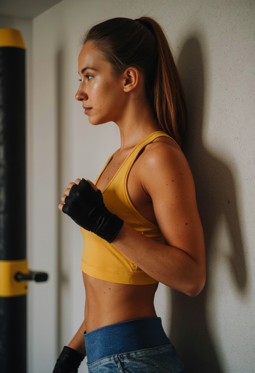 Примерить образ на себеЖенщина-боксёр с синими перчатками стоит у груши, руки подняты в защиту, спортивные леггинсы и топ. Её взгляд сосредоточен, волосы убраны в хвост, на лице — боевой настрой. Крупный план, светотени подчеркивают форму.