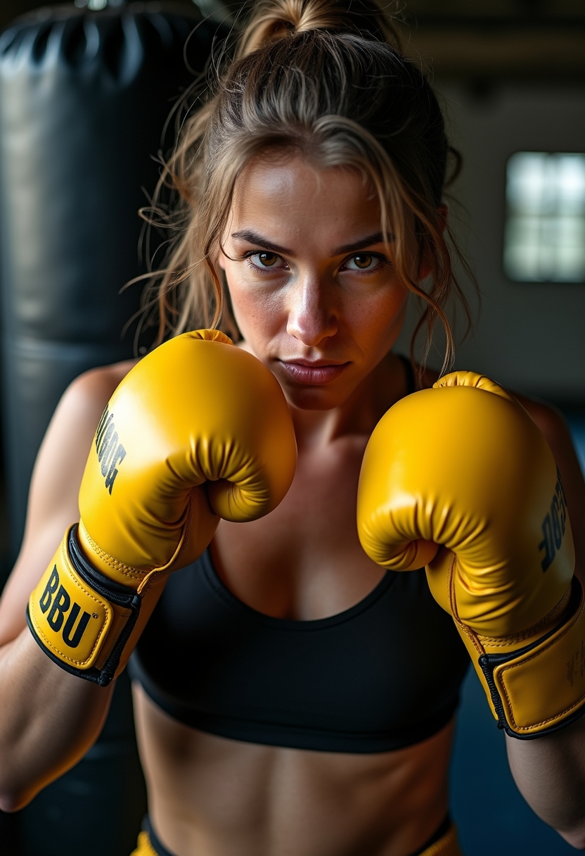 Женщина-боксёр с синими перчатками стоит у груши, руки подняты в защиту, спортивные леггинсы и топ. Её взгляд сосредоточен, волосы убраны в хвост, на лице — боевой настрой. Крупный план, светотени подчеркивают форму.
