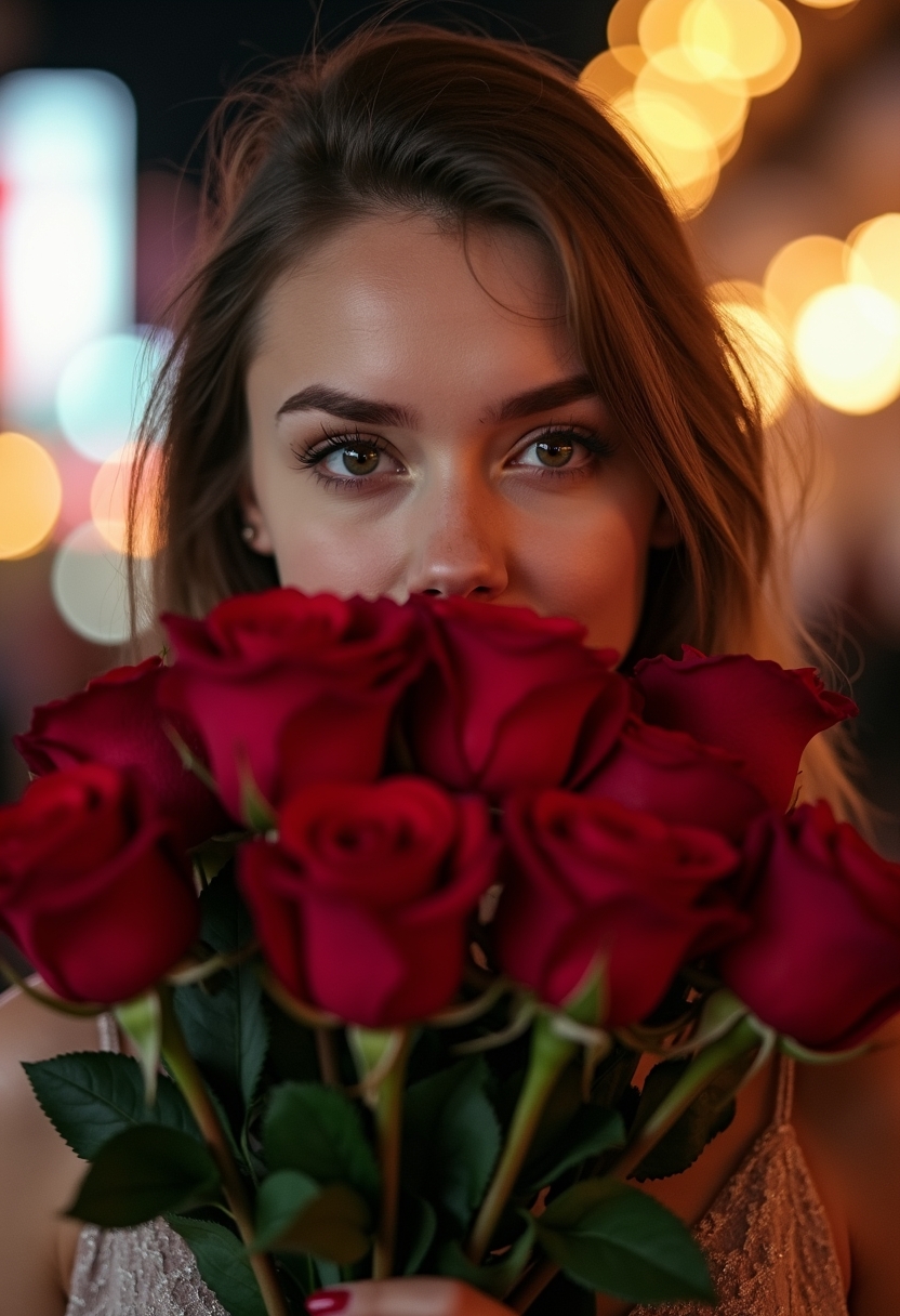 Женщина держит букет пышных красных роз, прикрывая ими нижнюю часть лица, её глаза ярко выделяются над цветами. Позади размытые огни города, создающие романтический фон. Крупный план, акцент на глубине взгляда и яркости цветов.