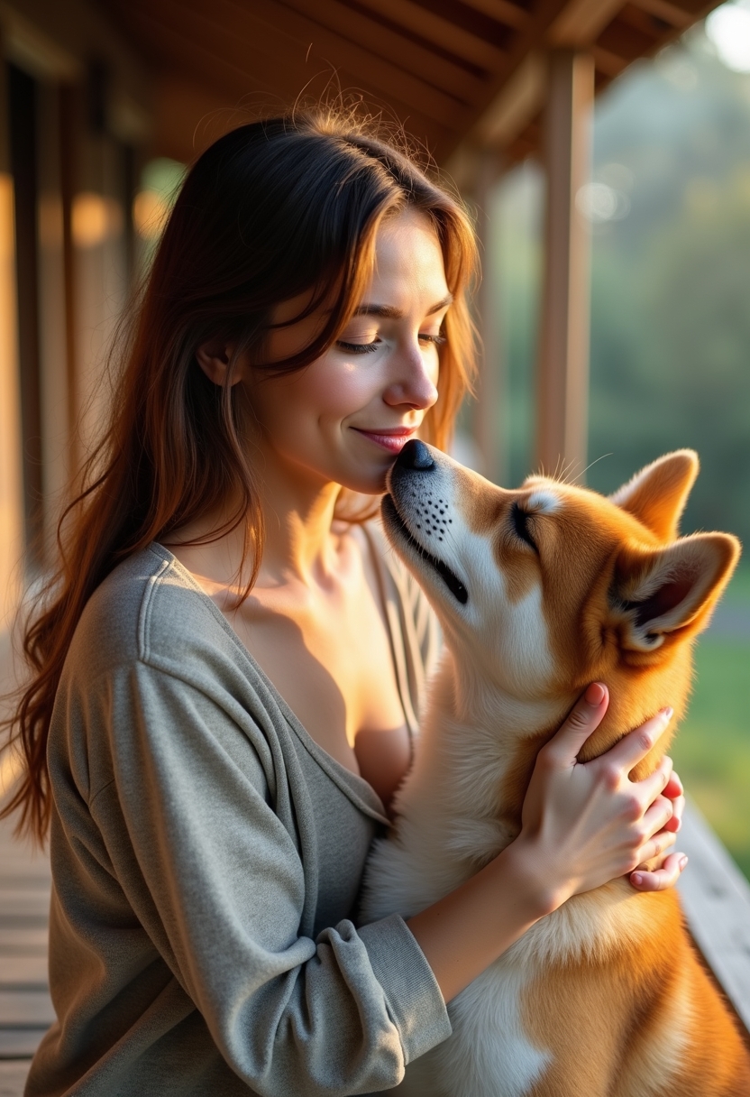 Женщина держит морду акиты обеими руками, её глаза полны любви и привязанности. Собака закрыла глаза, наслаждаясь моментом. Позади деревянная веранда, тёплый солнечный свет мягко подсвечивает сцену.