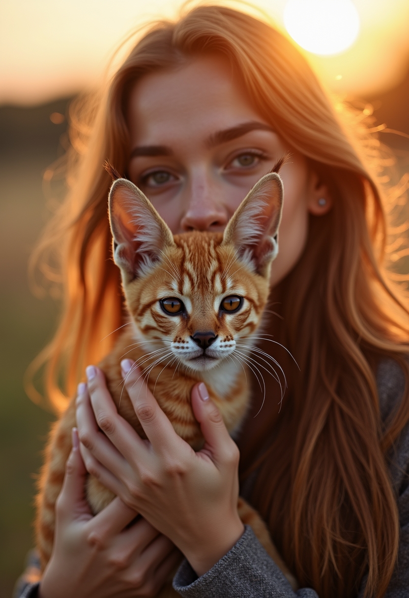 Женщина держит на руках небольшого рыжего каракала, его ушки торчат вверх, а глаза внимательно смотрят в объектив. Она слегка наклоняет голову, её пальцы аккуратно погружены в густую шерсть. Позади солнечный закат, освещение мягкое, подчёркивающее тепло сцены. Крупный план