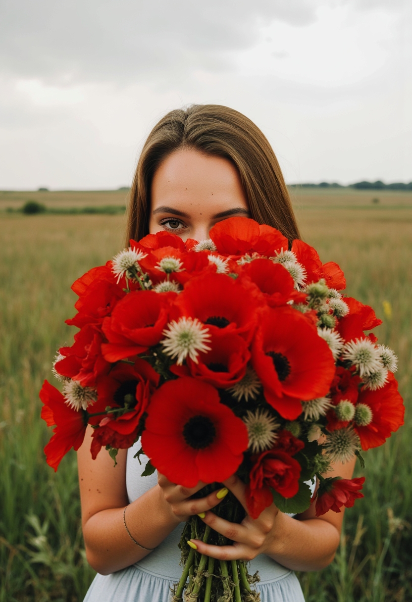 Женщина держит перед собой огромный букет алых маков и полевых цветов, их яркие лепестки создают контраст с мягким фоном. Её лицо слегка скрыто за цветами, но глаза сияют от радости. Позади поле с зелёной травой, солнечные лучи пробиваются сквозь облака.
