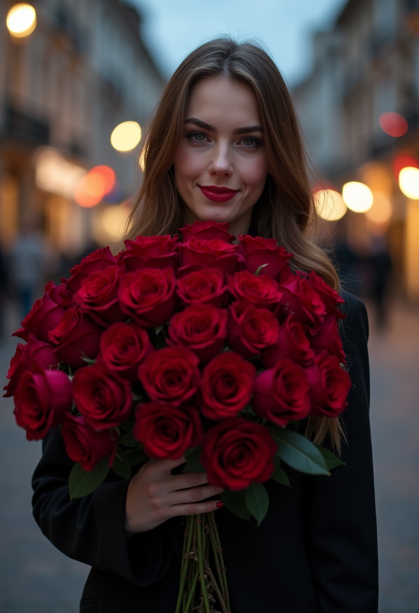 Женщина стоит на улице, обнимая массивный букет из красных роз, перевязанных широкой золотой лентой. Её глаза сияют, а лицо слегка выглядывает из-за пышных лепестков. Позади размытые городские огни. Освещение вечернее, подчёркивающее тепло момента.