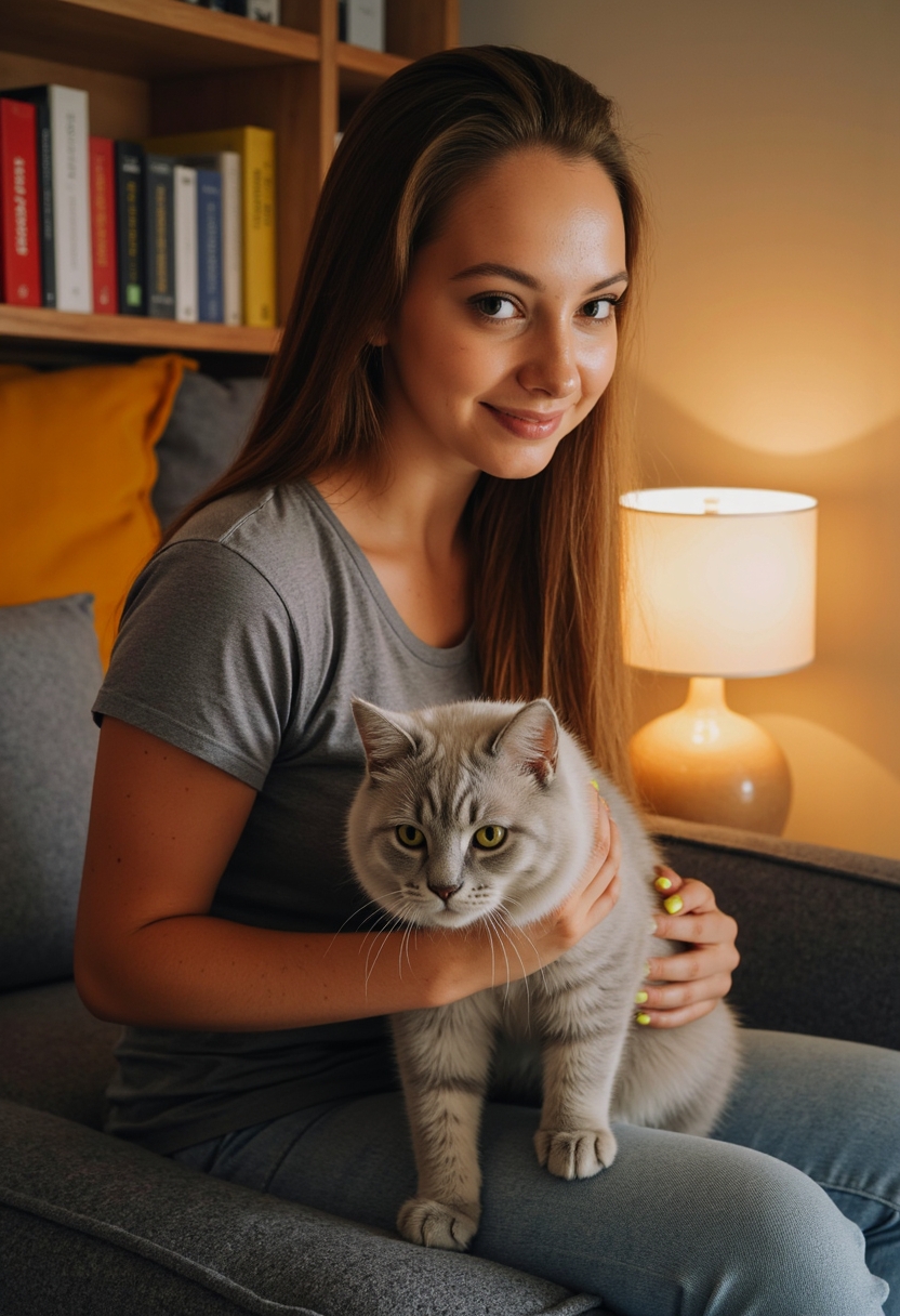 Женщина держит пушистого серого кота на руках, его голова слегка прижата к её щеке. Она улыбается в камеру, а её пальцы мягко погружаются в его мех. Позади тёплый свет лампы, книжные полки и уютное кресло.