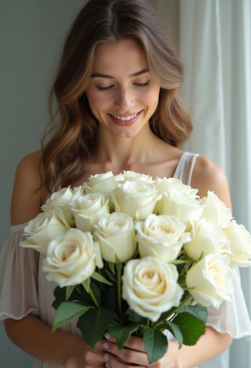 Женщина держит в руках большую охапку нежно-белых роз, слегка наклонив голову к букету. Её глаза закрыты, а губы мягко улыбаются. Позади размытый светлый фон с мягкими тенями. Крупный план, подчёркивающий интимность и нежность сцены.