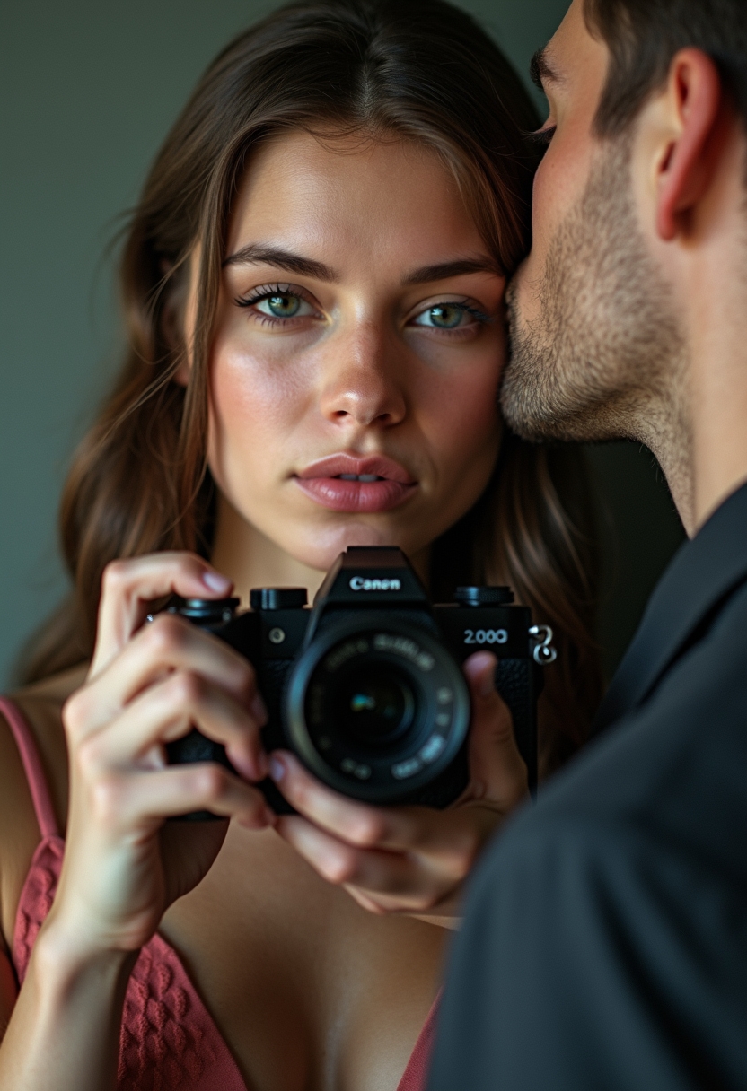 Женщина держит в руках фотоаппарат, направленный на зрителя, её парень целует её в висок. Она сосредоточена, он вне фокуса. Внимание на ней и моменте творчества.