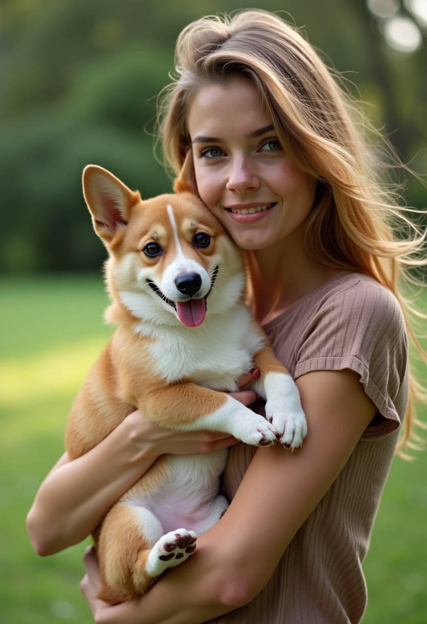 Женщина держит в руках маленького корги, его лапы расслабленно свисают, а язык торчит изо рта. Она смотрит прямо в камеру с лёгкой улыбкой, её волосы слегка развеваются ветром. Позади зелёный парк, освещение мягкое, естественное.