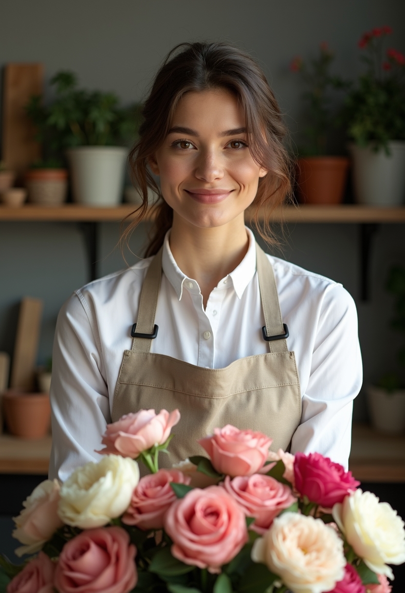 Женщина-флорист в идеально выглаженном светлом фартуке и белой блузе стоит за высоким рабочим столом с огромным букетом роз и пионов. Она смотрит прямо в камеру, уверенная и профессиональная улыбка. Позади — аккуратно расставленные инструменты и вазоны. Крупный план, студийный свет.