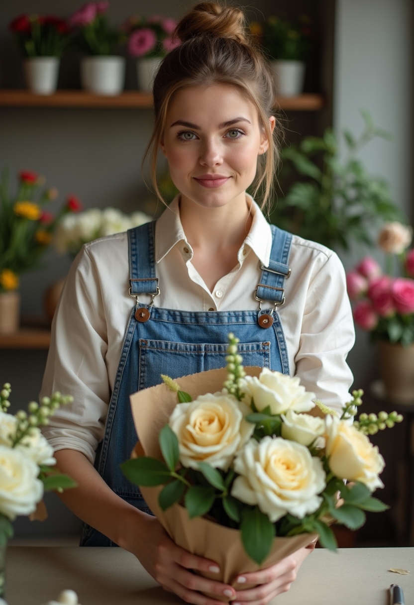 Женщина-флорист в стильном джинсовом комбинезоне и светлой рубашке аккуратно оборачивает готовый букет в крафтовую бумагу. Она смотрит в камеру с сосредоточенным и уверенным взглядом, позади рабочая зона с цветами. Крупный план, акцент на точности и чистоте.
