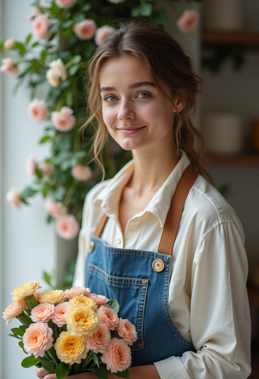 Женщина-флорист в идеально выглаженном светлом фартуке и белой блузе стоит за высоким рабочим столом с огромным букетом роз и пионов. Она смотрит прямо в камеру, уверенная и профессиональная улыбка. Позади — аккуратно расставленные инструменты и вазоны. Крупный план, студийный свет.