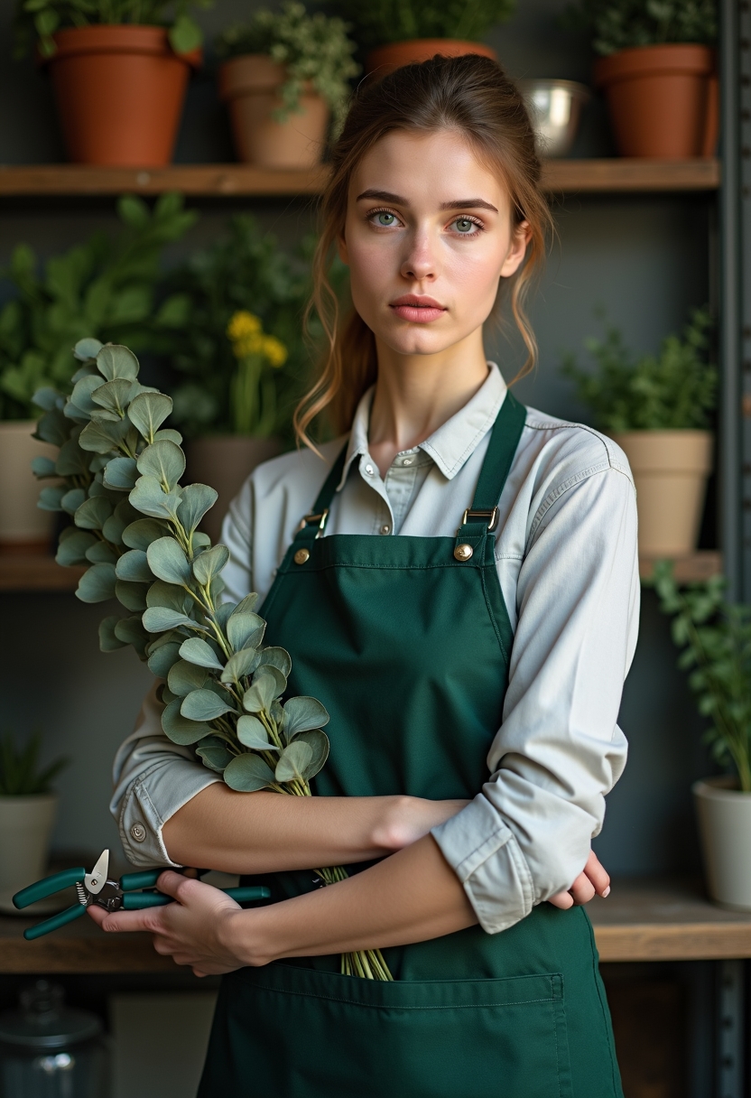 Женщина-флорист в тёмно-зелёном фартуке стоит на фоне стеллажа с цветами, в руках держит ветку эвкалипта и секатор. Она смотрит в объектив, лицо серьёзное и профессиональное, свет мягкий и ровный. Крупный план.
