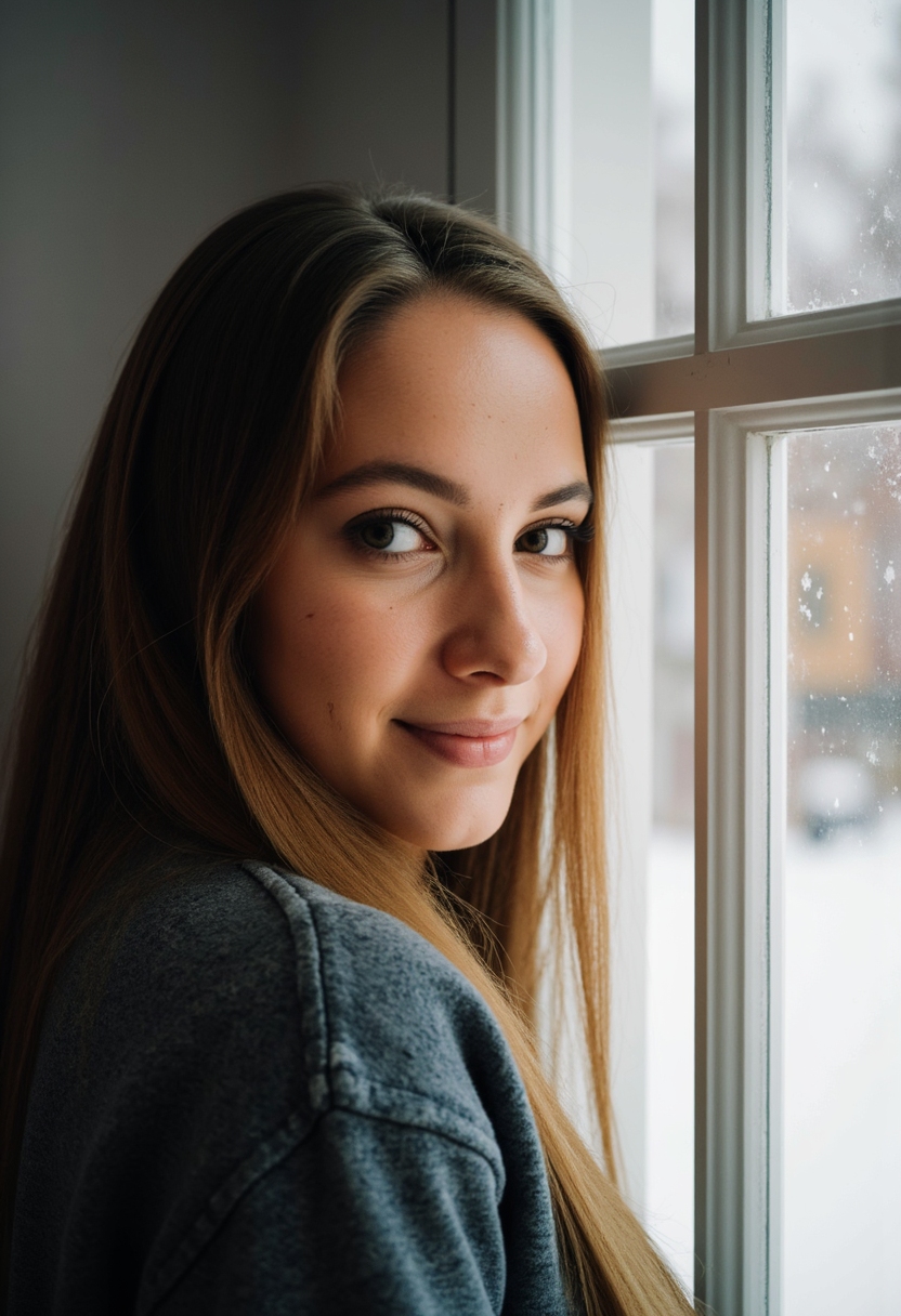 Женщина, глядя в окно, где снежинки тихо падают на землю, смотрит в камеру с мечтательным взглядом, наполняя атмосферу волшебством и ожиданием праздника