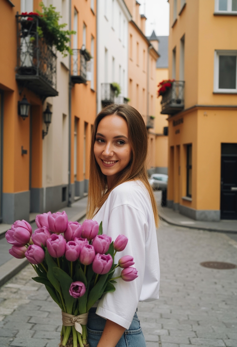 Женщина идёт по мощёной улочке старого города, держа в руках тюльпаны насыщенного фиолетового цвета, перевязанные атласной лентой. Она поворачивается через плечо, её улыбка искренняя, а глаза сияют. Позади старинные здания с балконами, украшенными цветами. Ближний план, создающий ощущение живого...