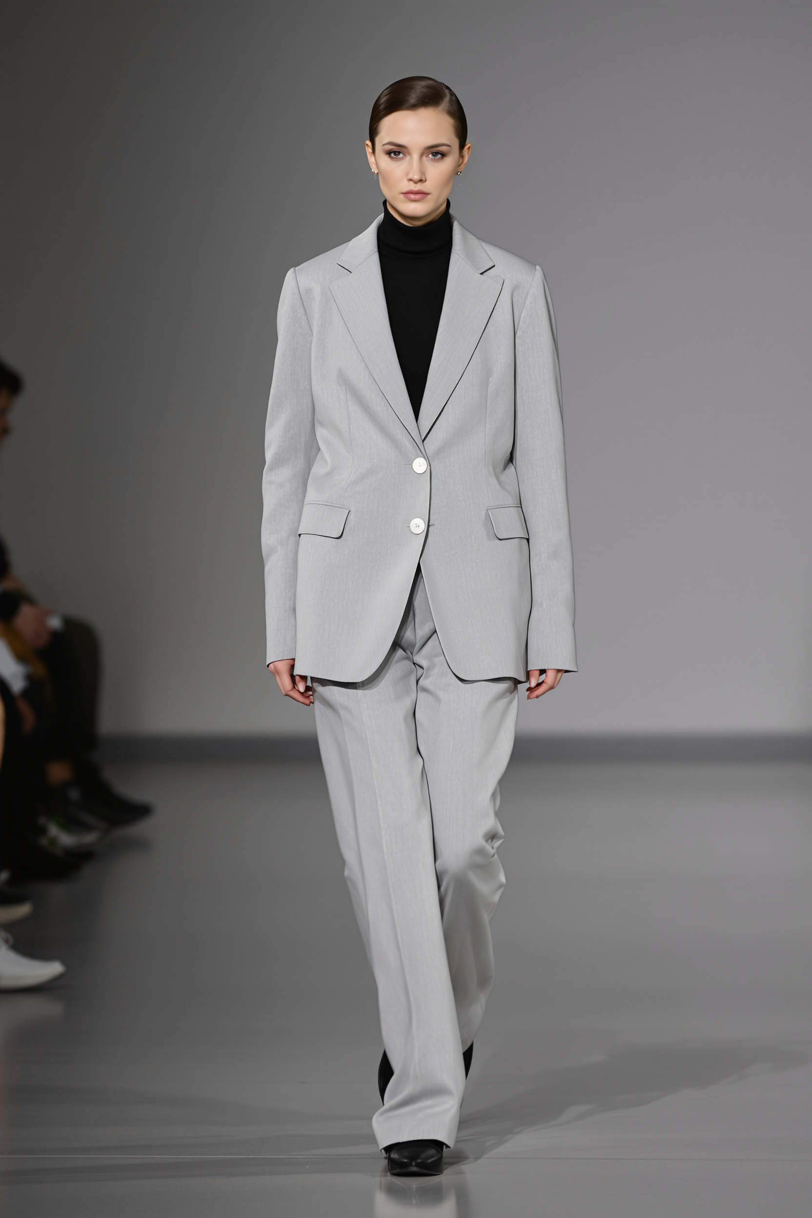 Женщина идет по подиуму. На ней светло-серый костюм: удлиненный пиджак на одной пуговице и классические брюки, под пиджаком простая черная водолазка. Минималистичный фон, мягкое освещение, средний план, смотрит в камеру.