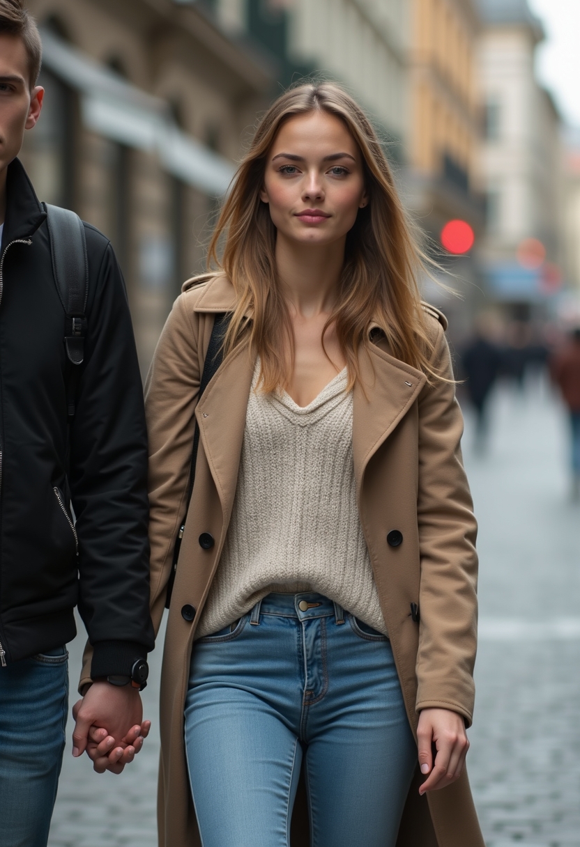 Женщина идёт по улице, взяв парня за руку, но тянет его за собой. Она смотрит прямо в камеру с решительностью и драйвом. Парень в кадре частично, создавая ощущение движения. Акцент на её характере.