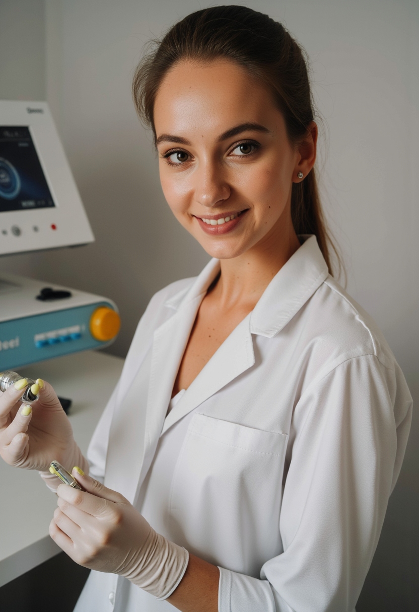 Женщина-косметолог в стерильной одежде стоит у современного лазерного аппарата для удаления пигментации, держит инструкцию, смотрит в камеру