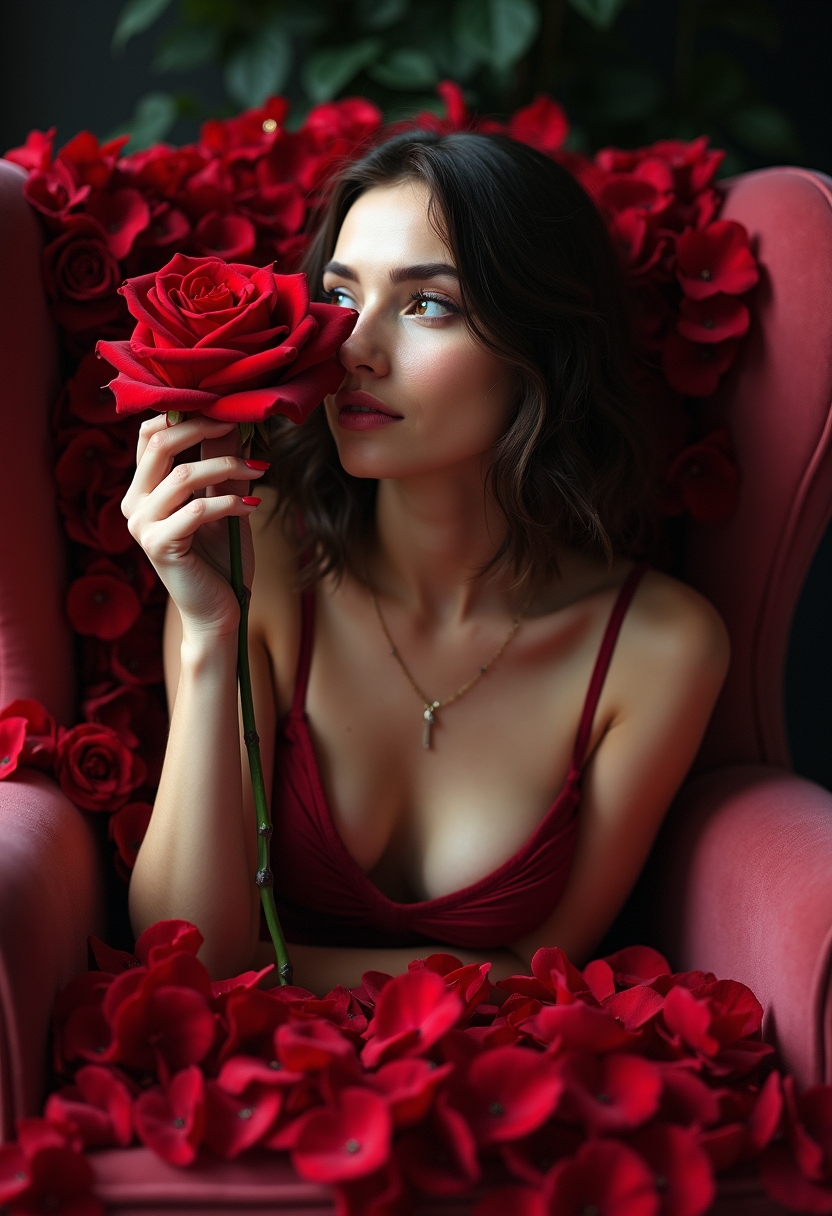 Женщина лежит на бархатном кресле, покрытом лепестками роз разных оттенков. Она держит одну крупную розу у лица, её взгляд направлен в сторону с лёгкой загадочной улыбкой. Позади приглушённое освещение и глубокие оттенки ткани. Крупный план, акцент на чувственности и тепле образа.