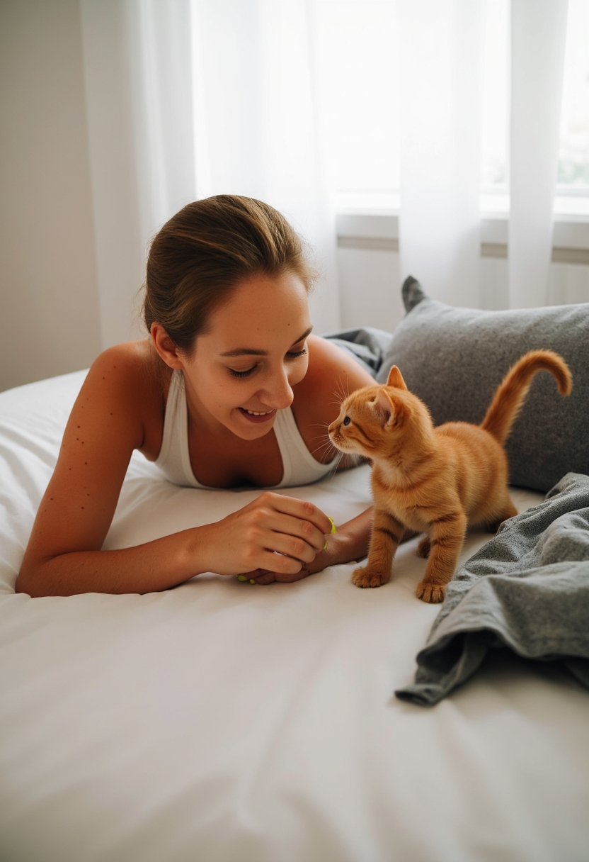 Женщина лежит на кровати, её руки вытянуты к маленькому рыжему котёнку, который любопытно тянется к ней. Она смеётся, а котёнок игриво шевелит ушками. Позади мягкий свет от окна, создающий утреннюю атмосферу.
