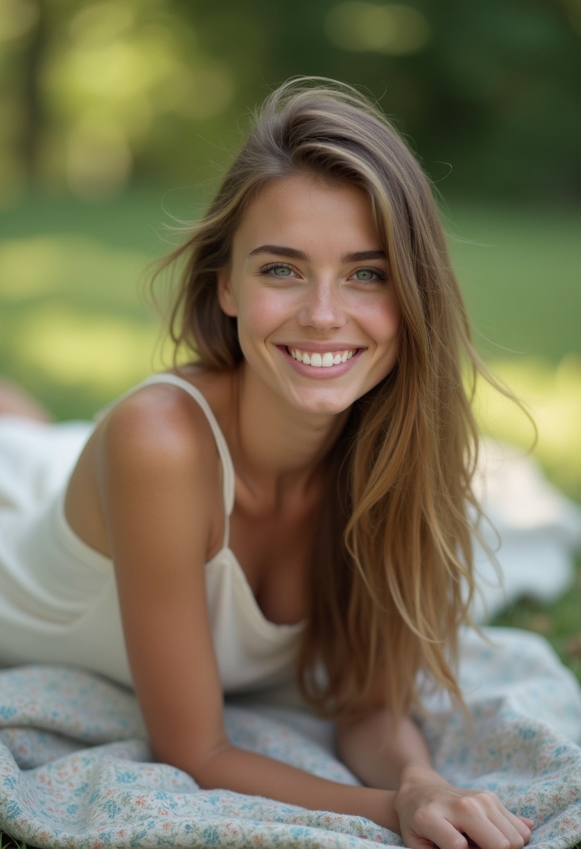Женщина лежит на животе на одеяле в парке, её парень лежит рядом, но слегка в тени. Она улыбается и смотрит прямо в камеру, её волосы рассыпаны по плечам. Крупный план, акцент на её расслабленности и искренности.