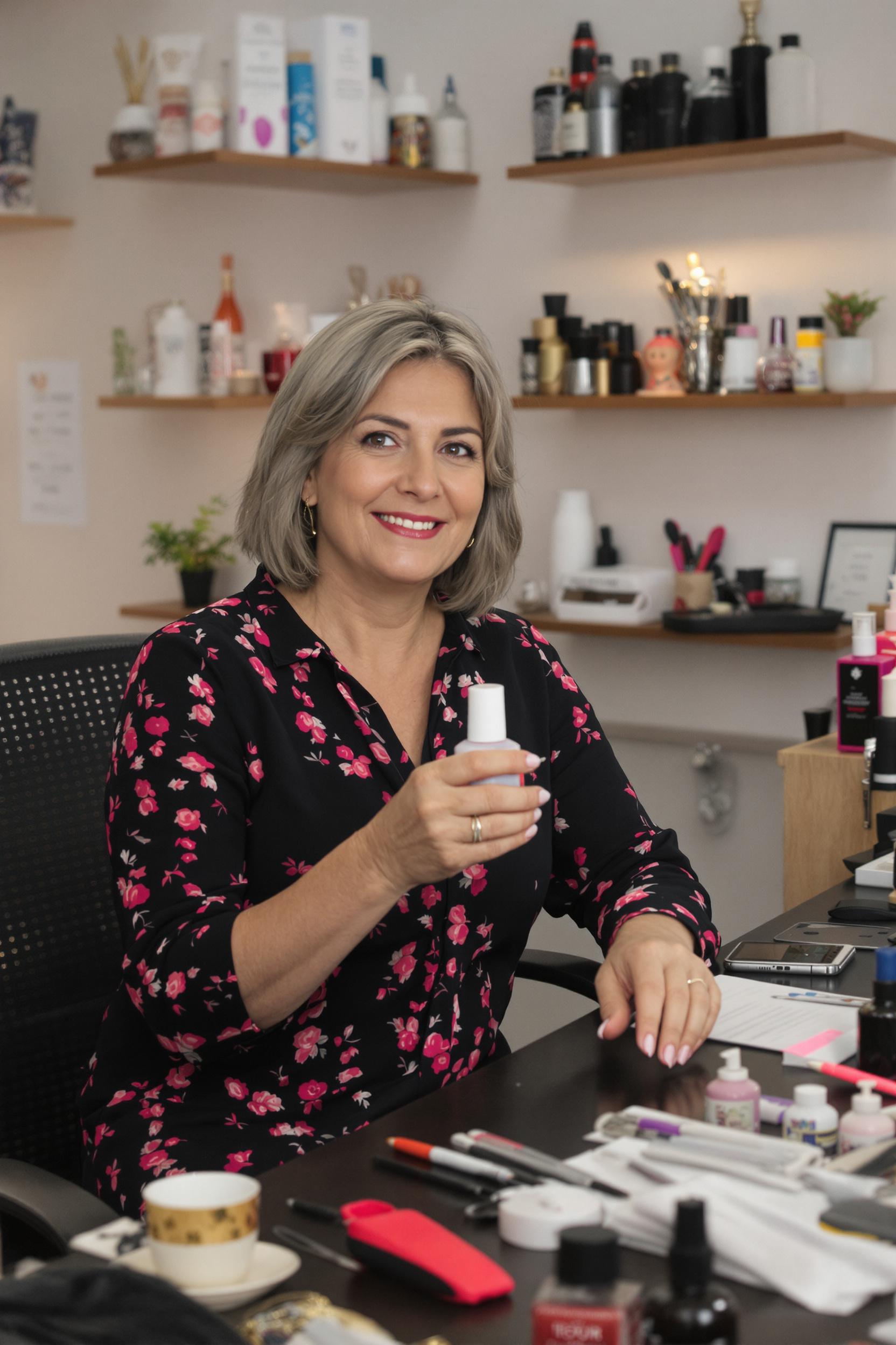 Женщина-мастер маникюра среднего возраста сидит за рабочим столом салона, держит флакон лака и кисточку, смотрит прямо в камеру, легкая улыбка, на столе инструменты, аккуратный интерьер, акцент на профессионализме и уютной атмосфере.