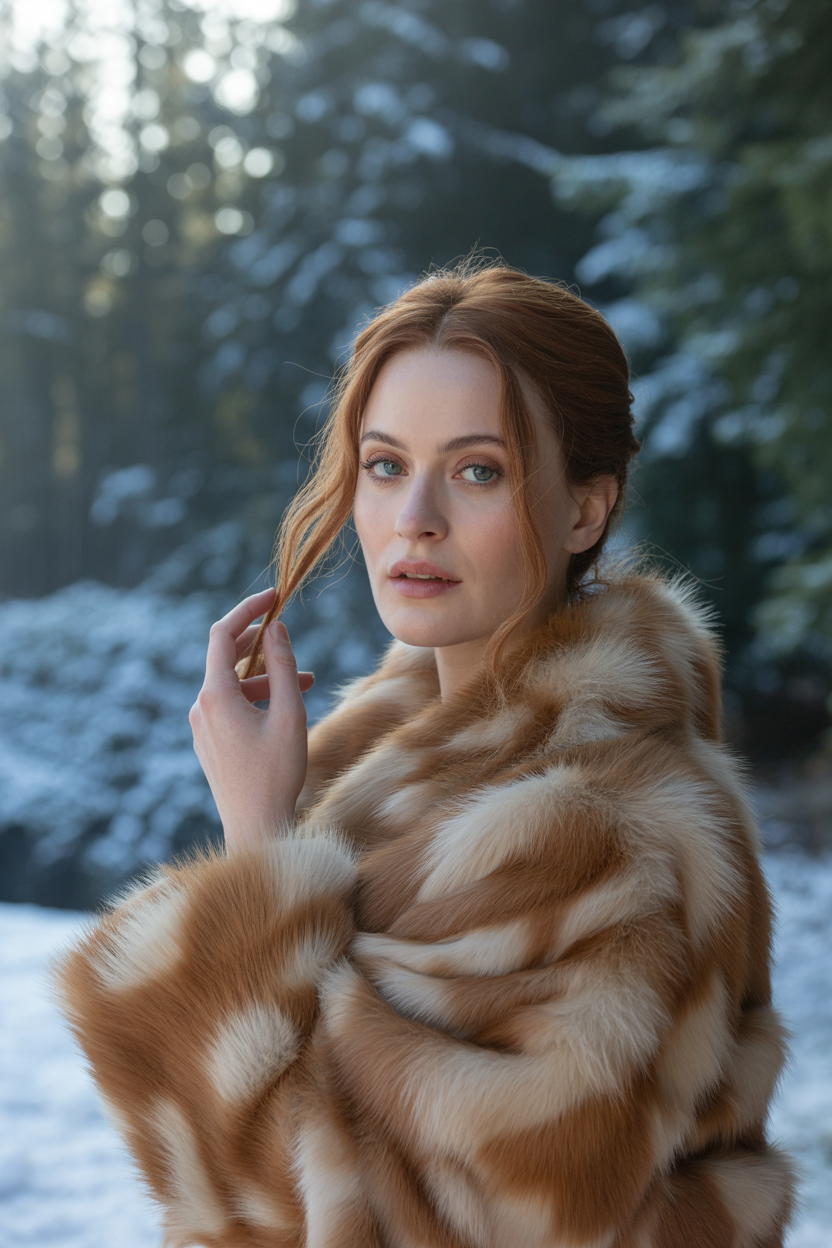 Женщина на фоне густых зеленых елей, в стильной соболиной шубе насыщенного карамельного оттенка с широким пушистым воротником. В среднем плане она опирается локтем на ствол дерева, другая рука касается волос, прямой взгляд в камеру. Волосы распущены, на лице естественный макияж, атмосфера винтажного...