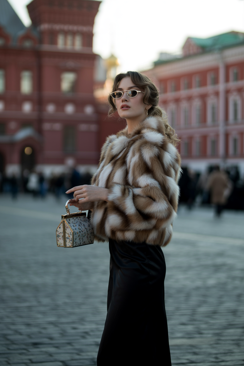 Женщина на фоне Красной площади в роскошной соболиной шубе, под шубой элегантное черное платье миди. Стоит в пол-оборота, смотрит прямо в камеру. На лице – гламурный макияж, волосы распущены, в руках маленькая лакированная сумочка, образ дополняют ретро солнечные очки.