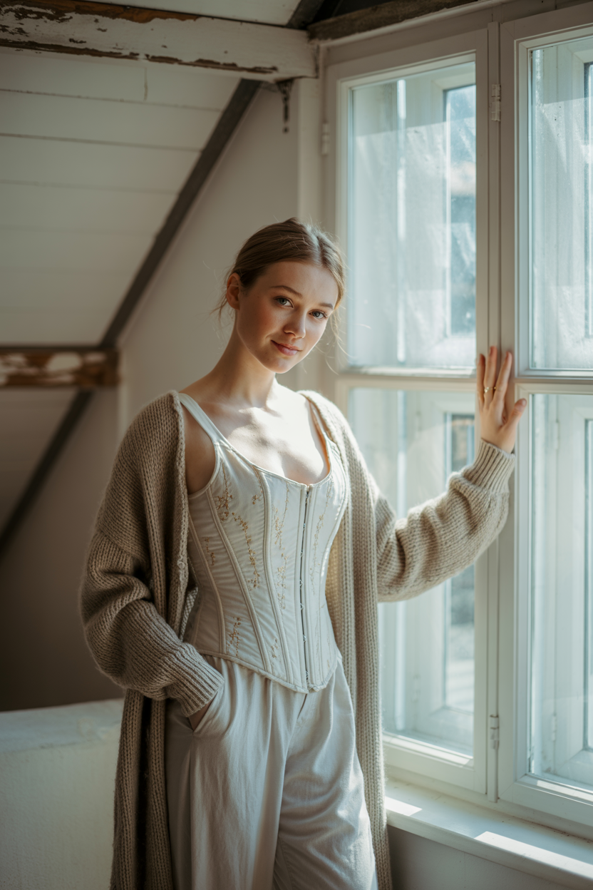 Женщина на фоне просторной белой мансарды с большими окнами, одета в белый корсет с изящной золотой вышивкой, свободные льняные брюки и длинный вязаный кардиган. Она стоит босиком у окна, одной рукой прикасаясь к стеклу, смотрит в камеру с лёгкой улыбкой, по комнате рассыпан мягкий рассеянный свет.