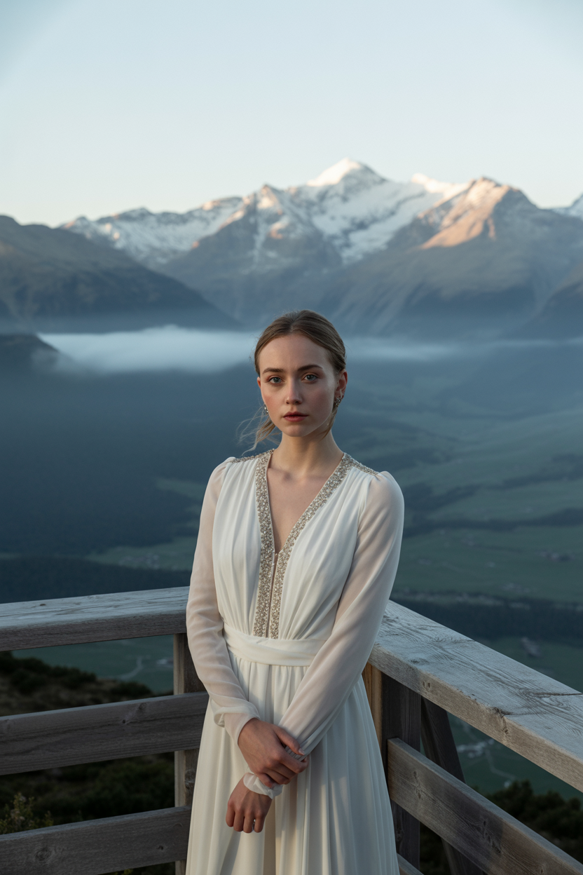 Женщина на фоне величественного горного пейзажа стоит на деревянной смотровой площадке в струящемся свадебном платье с длинными полупрозрачными рукавами и серебристым бисерным декором вдоль выреза, обе руки скрещены перед собой, смотрит прямо в камеру, вокруг рассвет, легкий туман и ощущение свободы.