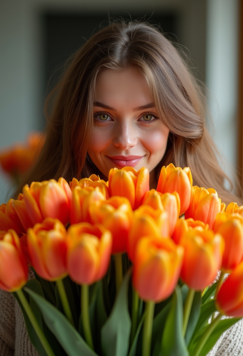 Женщина на фоне зеркальной стены держит перед собой огромный букет ярко-оранжевых тюльпанов, отражение цветов создаёт эффект бесконечного цветочного узора. Она смотрит в камеру с лёгкой улыбкой, а боковое освещение подчёркивает мягкость её черт. Крупный план, фокус на насыщенных оттенках и игре света.
