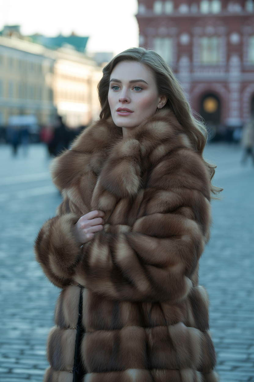 Женщина на Красной площади в длинной соболиной шубе насыщенного коричневого цвета с объемным воротником, стоит в среднем плане лицом к камере, смотрит прямо, на лице гламурный макияж, волосы распущены, атмосфера винтажного советского журнала, акцент на роскоши меха.