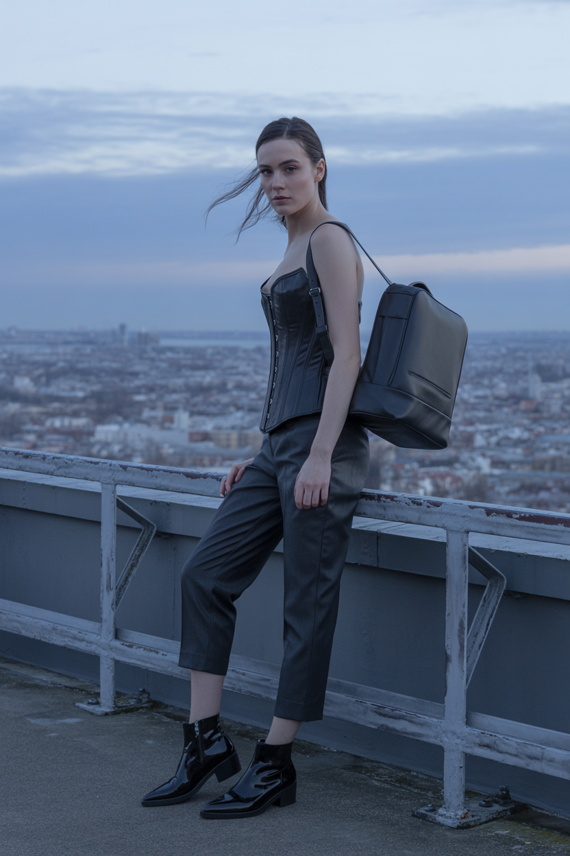 Женщина на крыше городского здания, одета в черный кожаный корсет, укороченные брюки и лаковые ботильоны. Она стоит, облокотившись на перила, с деловым рюкзаком на одном плече, внимательно смотрит в камеру, волосы разлетаются от ветра, вокруг урбанистический пейзаж.