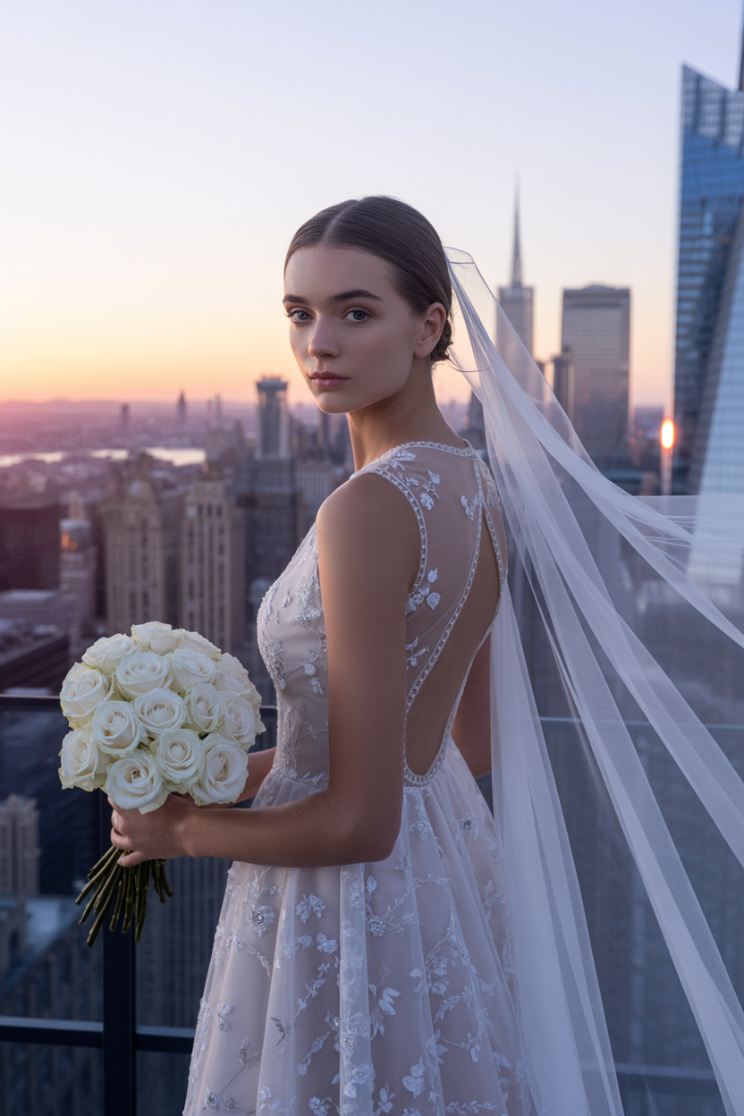 Женщина на крыше современного небоскреба в изящном облегающем свадебном платье с открытой спиной, украшенном нежной вышивкой и прозрачной фатой, держит букет белых роз, смотрит прямо в камеру, вокруг городской закат и панорама мегаполиса, легкий ветер развевает фату.