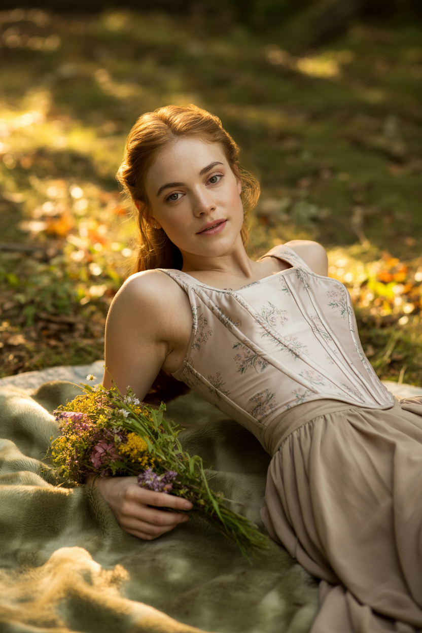 Женщина на лесной поляне среди золотой листвы, одета в светлый корсет с цветочным принтом и длинную струящуюся юбку цвета беж. Она полулежит на мягком пледе, опершись на одну руку, второй держит венок из полевых цветов, прямо и ласково смотрит в камеру, вокруг утренний солнечный свет.