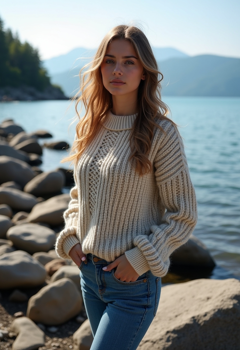 Женщина стоит на фоне Баргузинской долины на Байкале, на ней образный свитер светлых тонов, который подчеркивает её фигуру. Её волосы развеваются на ветер, лицо слегка повернуто к солнцу, отражая спокойствие и гармонию с природой. За ней величественные горные массивы, покрытые зеленью и горами,...