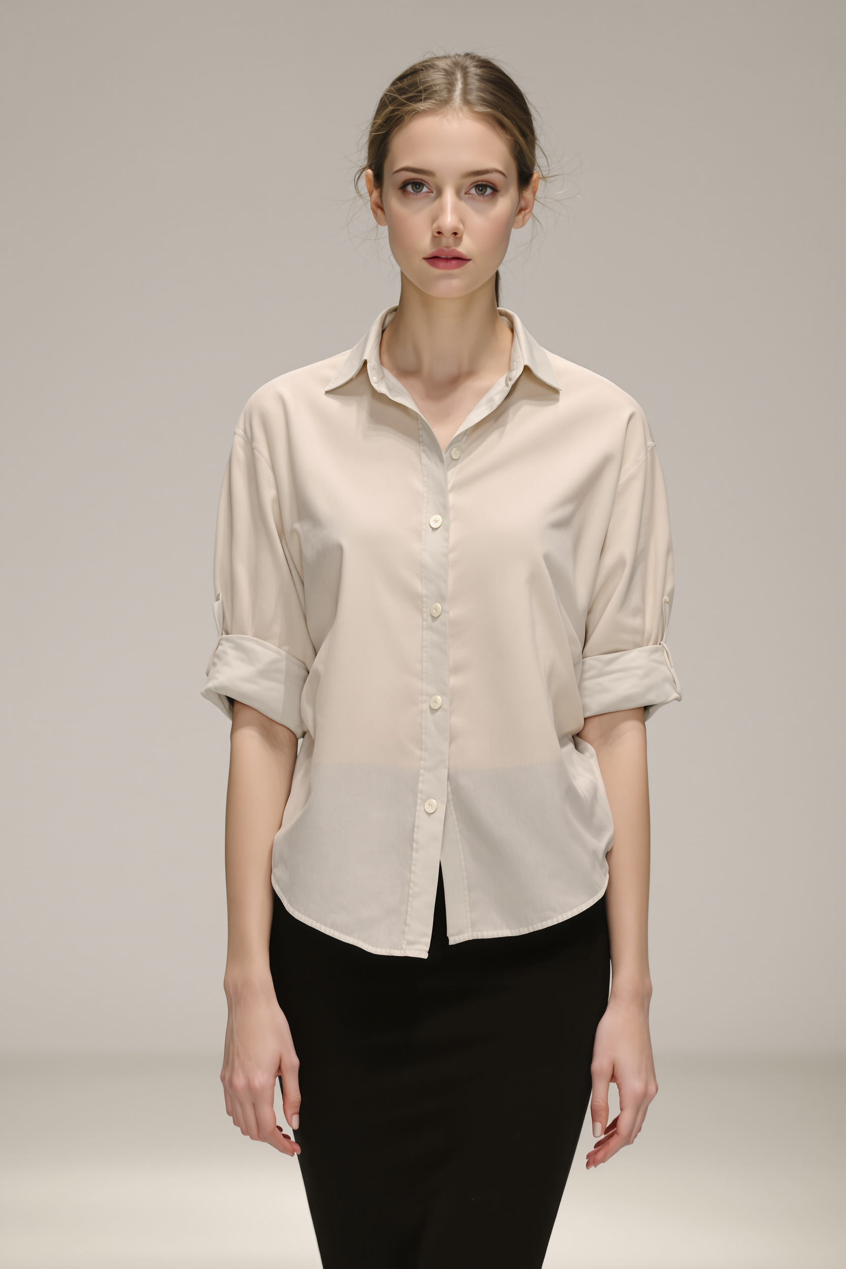 Женщина на подиуме. На ней светло-бежевая рубашка свободного кроя, заправленная в строгую черную юбку-карандаш до колена, акцент на минимализме, смотрит прямо в камеру. Фон однородный, освещение мягкое, средний план.