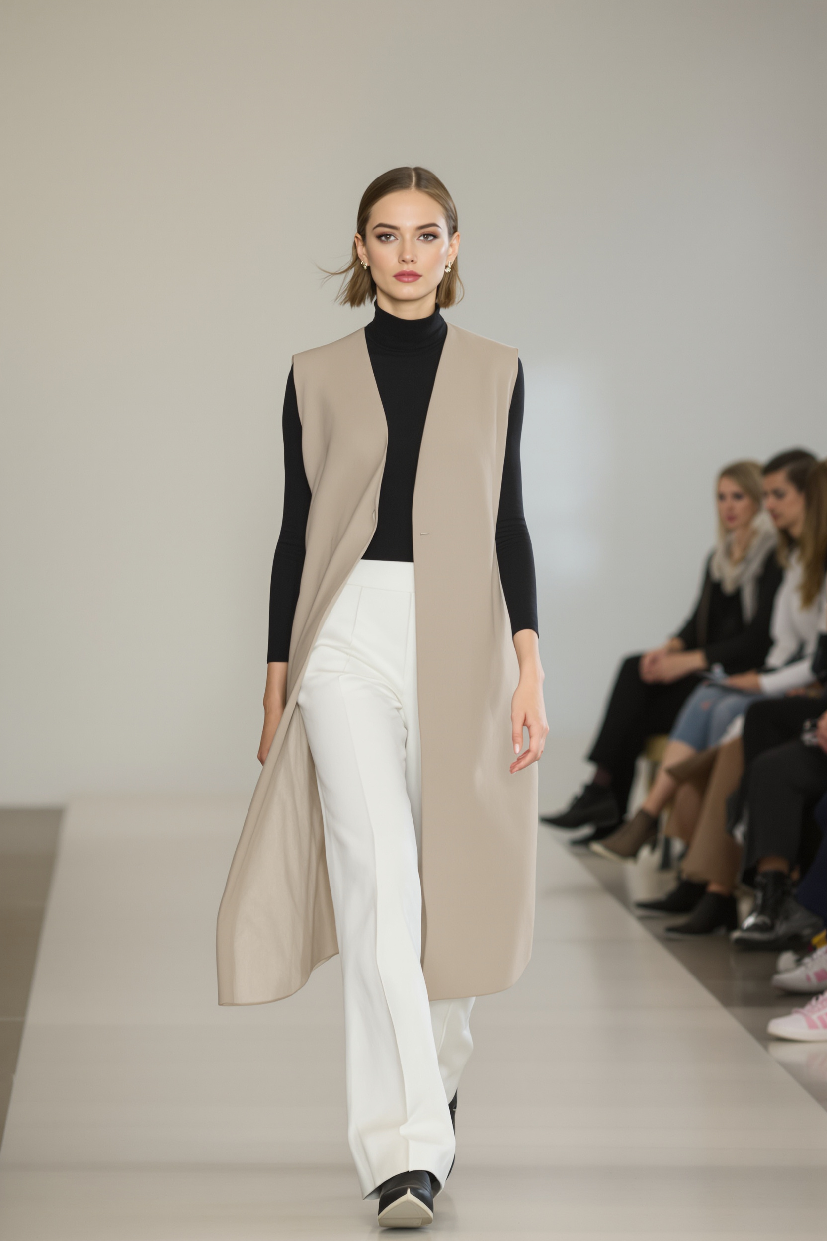 Женщина на подиуме, на ней удлинённая светло-коричневая жилетка без рукавов, смотрит в камеру, под ней черная водолазка и прямые белые брюки. Интерьер минималистичный, фон нейтральный, мягкое естественное освещение, средний план.
