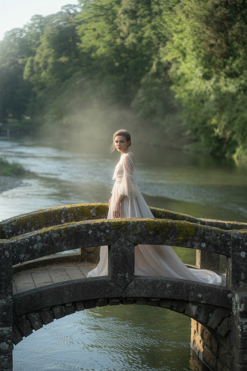 Женщина на старинном каменном мосту над тихой рекой в роскошном свадебном платье с длинным струящимся шлейфом, кружевными рукавами и прозрачной накидкой, стоит, положив одну руку на перила, смотрит прямо в камеру, вокруг зелёные деревья и легкая дымка утра, атмосфера загадочности и мечты.