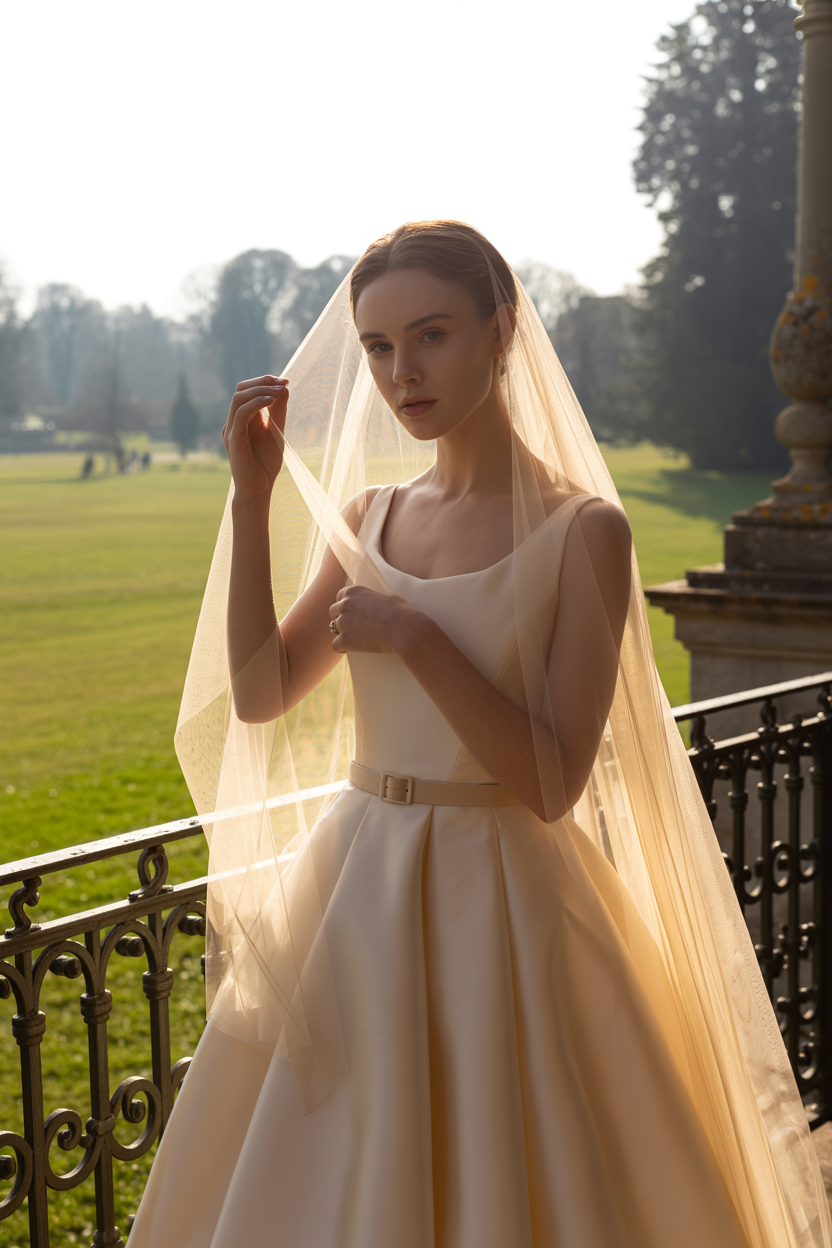 Женщина на террасе загородного особняка в изысканном свадебном платье с объёмной вышивкой и атласным поясом, украшенном легкой воздушной накидкой, стоит у кованых перил, смотрит прямо в камеру, одной рукой поправляет невесомую фату, вокруг зелёный парк и солнечные лучи.