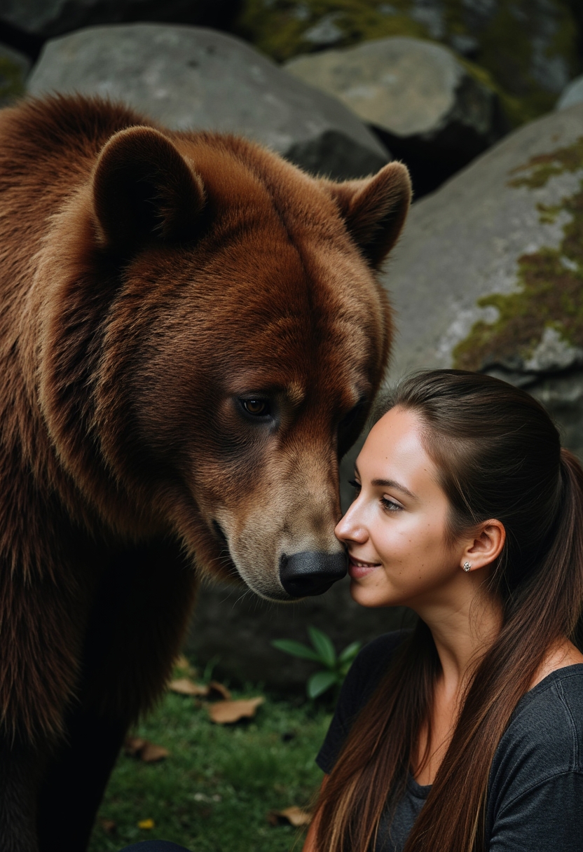 Женщина наклонилась к морде медведя, её глаза смотрят прямо в его тёмные, глубокие глаза. Их лица почти касаются, создавая ощущение полного доверия. Позади скалы, покрытые мхом, освещение мягкое и естественное.