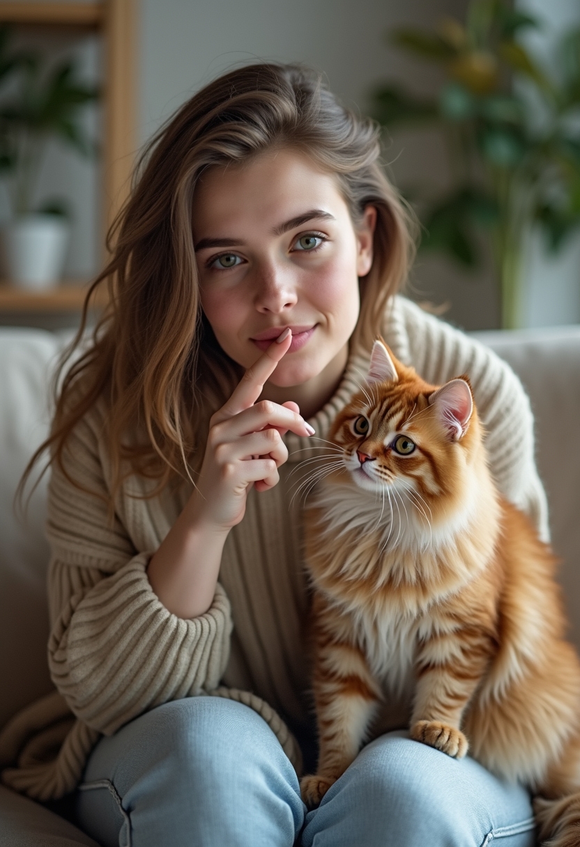 Женщина наклонилась к пушистому шотландскому коту, который сидит у неё на коленях. Она игриво касается его носа кончиком пальца, а кот удивлённо смотрит в камеру. Позади минималистичный интерьер с растениями и деревянной мебелью.