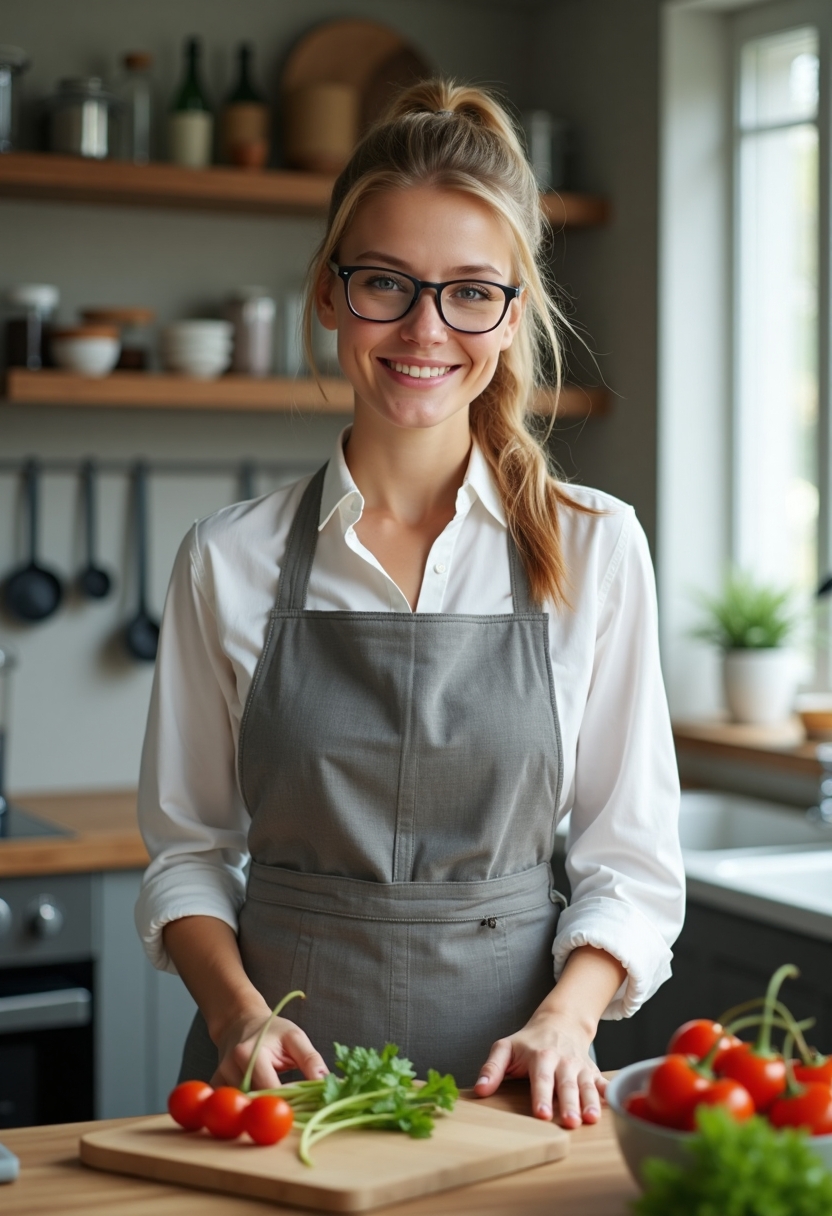 Женщина-нутрициолог с хвостом и очками стоит у кухни, на столе — разделочная доска с овощами и блендер. Она смотрит в камеру, улыбаясь, атмосфера светлая и профессиональная. Крупный план.