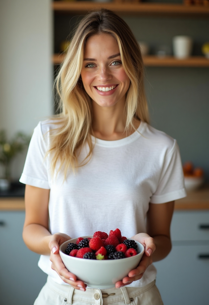Женщина-нутрициолог в белой футболке и светлых брюках стоит с чашей свежих ягод, показывает жестом на миску, глядя в камеру. Крупный план, атмосфера открытости и заботы.