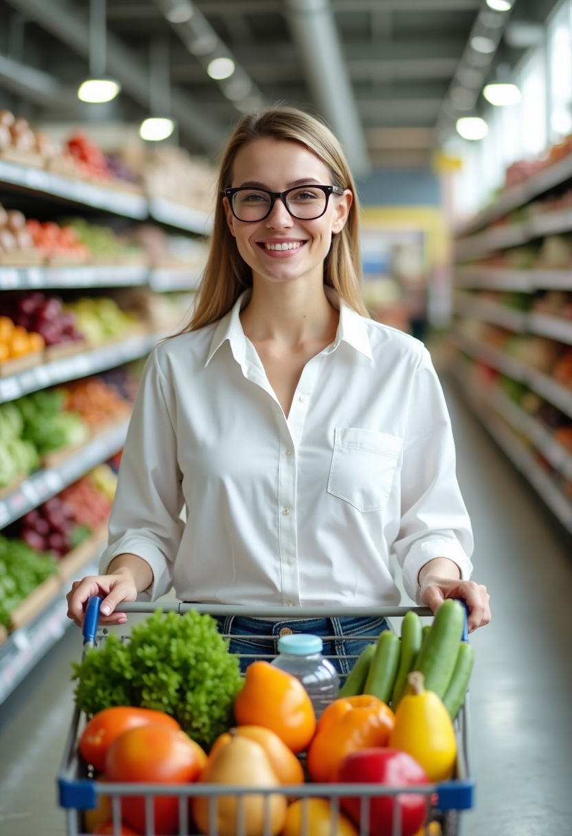 Женщина-нутрициолог в белой рубашке и очках идёт по супермаркету с тележкой, наполненной овощами, фруктами и бутылкой воды. Она улыбается и смотрит в камеру, светлый интерьер. Крупный план.