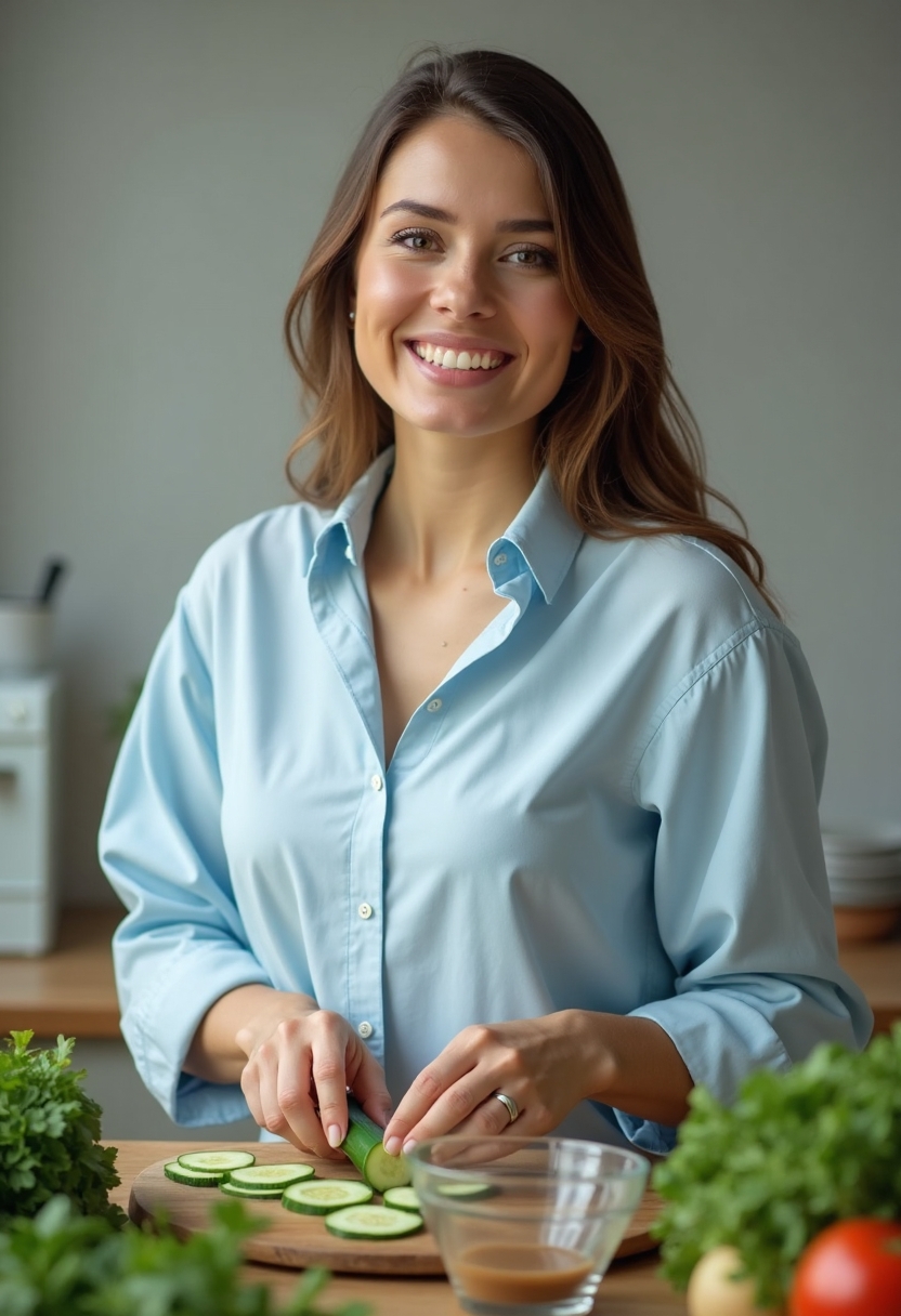 Женщина-нутрициолог в нежно-голубой блузе нарезает огурцы на деревянной доске, улыбается, смотря в камеру. Вокруг — свежие зелёные овощи и стеклянная миска. Крупный план, светлая студия.
