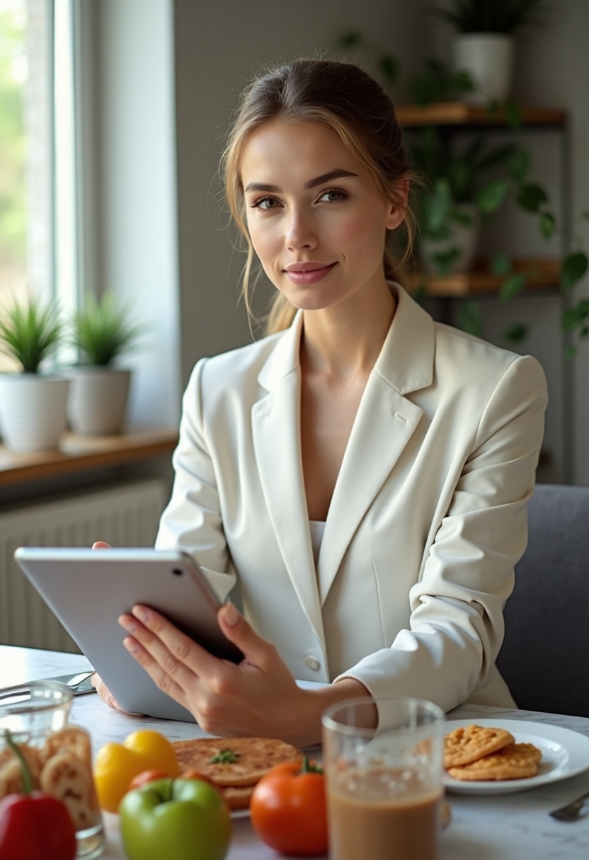 Женщина-нутрициолог в светлом офисном костюме держит планшет с изображением сбалансированного рациона. На столе — полезные снеки и кувшин с водой. Крупный план, акцент на цифровых технологиях.