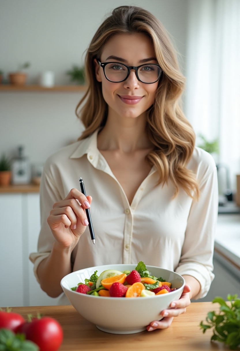Женщина-нутрициолог в светлой рубашке и очках держит в руках чашу с фруктовым салатом, показывая на неё ручкой. Она смотрит в объектив, позади белый интерьер. Крупный план, акцент на образовательном моменте.
