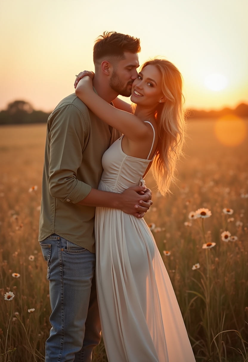 Женщина обнимает парня за шею и смотрит в камеру, он её слегка поднимает. Они в поле, позади тёплое вечернее солнце. Она — как центр любви, движения и света.